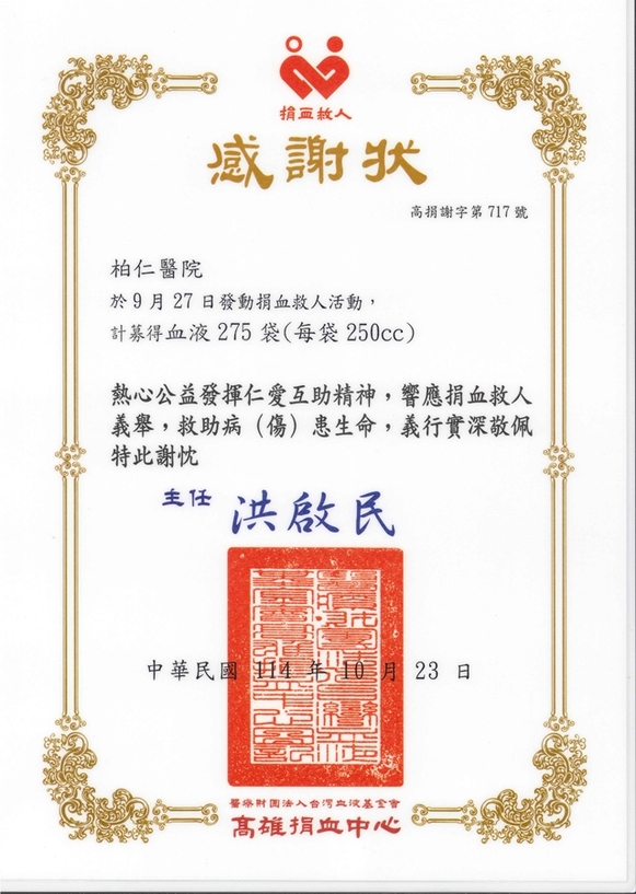 柏仁醫院一年一度舉辦的~ 讓愛延續捐血活動圓滿結束,感謝大家熱情參與且耐心等候,此次活動共募得275袋血,愛心不間斷我們明年見。
